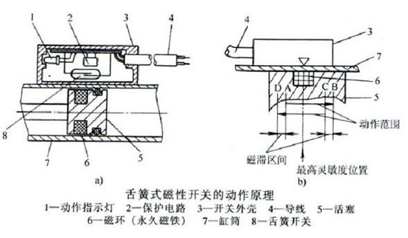 將舌簧開關(guān)成型于合成樹脂塊內(nèi),帶有磁環(huán)的氣缸活塞向右運(yùn)動(dòng)到A位置,舌簧開關(guān)進(jìn)入磁場(chǎng)內(nèi),兩簧片被磁化而相互吸引,觸點(diǎn)閉合,發(fā)出一電信號(hào);活塞運(yùn)動(dòng)到B位置時(shí),舌簧開關(guān)離開磁場(chǎng),簧片失磁,觸點(diǎn)自動(dòng)脫開。A-B區(qū)間稱為磁性開關(guān)的動(dòng)作范圍。活塞向左反向運(yùn)動(dòng)時(shí),動(dòng)作范圍是C-D區(qū)間。有觸點(diǎn)式磁性開關(guān)的動(dòng)作范圍一般在5-14mm。B-C區(qū)間和D-A區(qū)間稱為磁滯區(qū)間,此區(qū)間通常小于2mm??鄢艤^(qū)間的動(dòng)作范圍為最適合安裝位置,其中間位置稱為最高靈敏度位置。若磁環(huán)停止在磁滯位置,則開關(guān)動(dòng)作不穩(wěn)定,易受外界干擾。